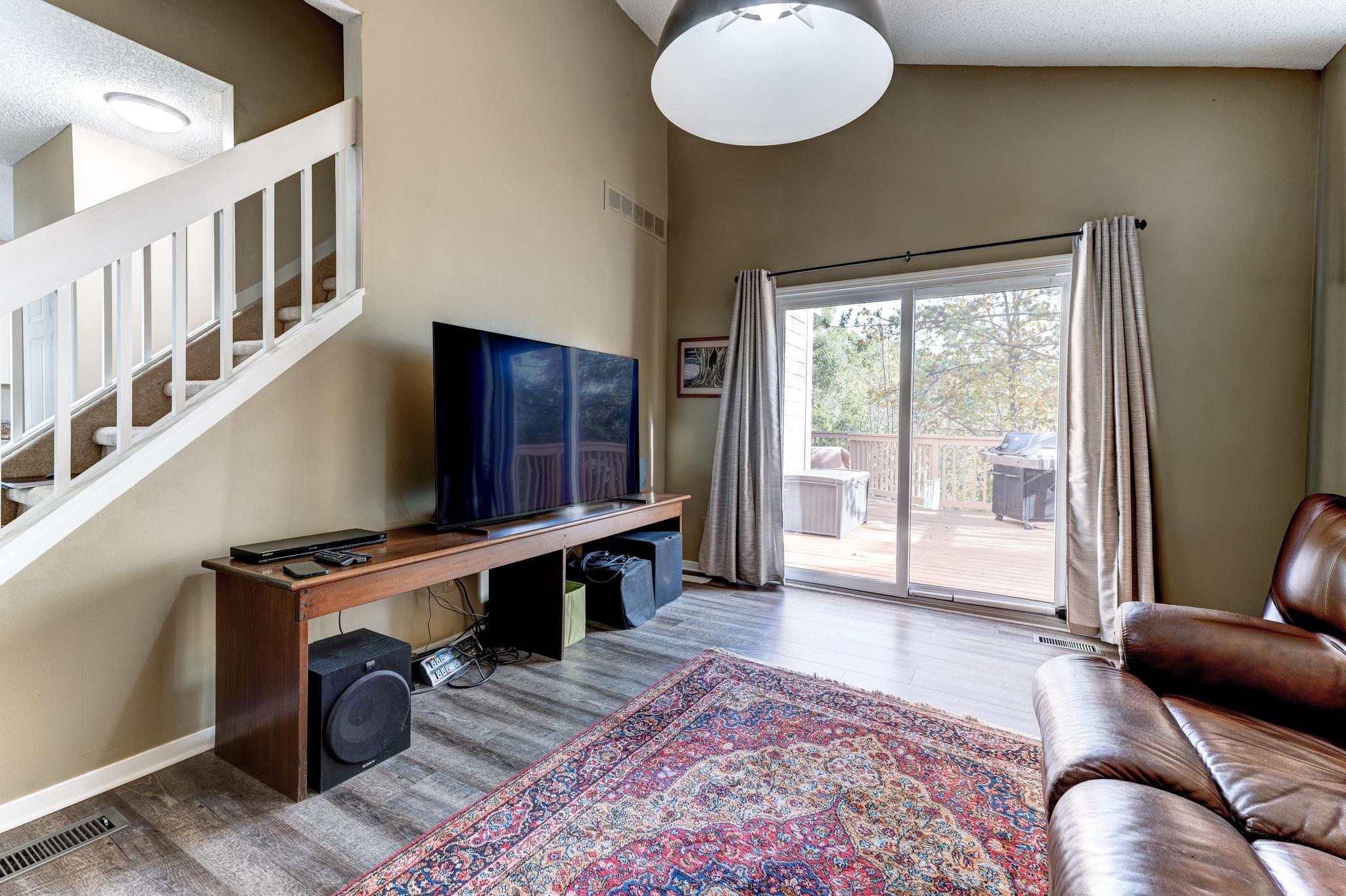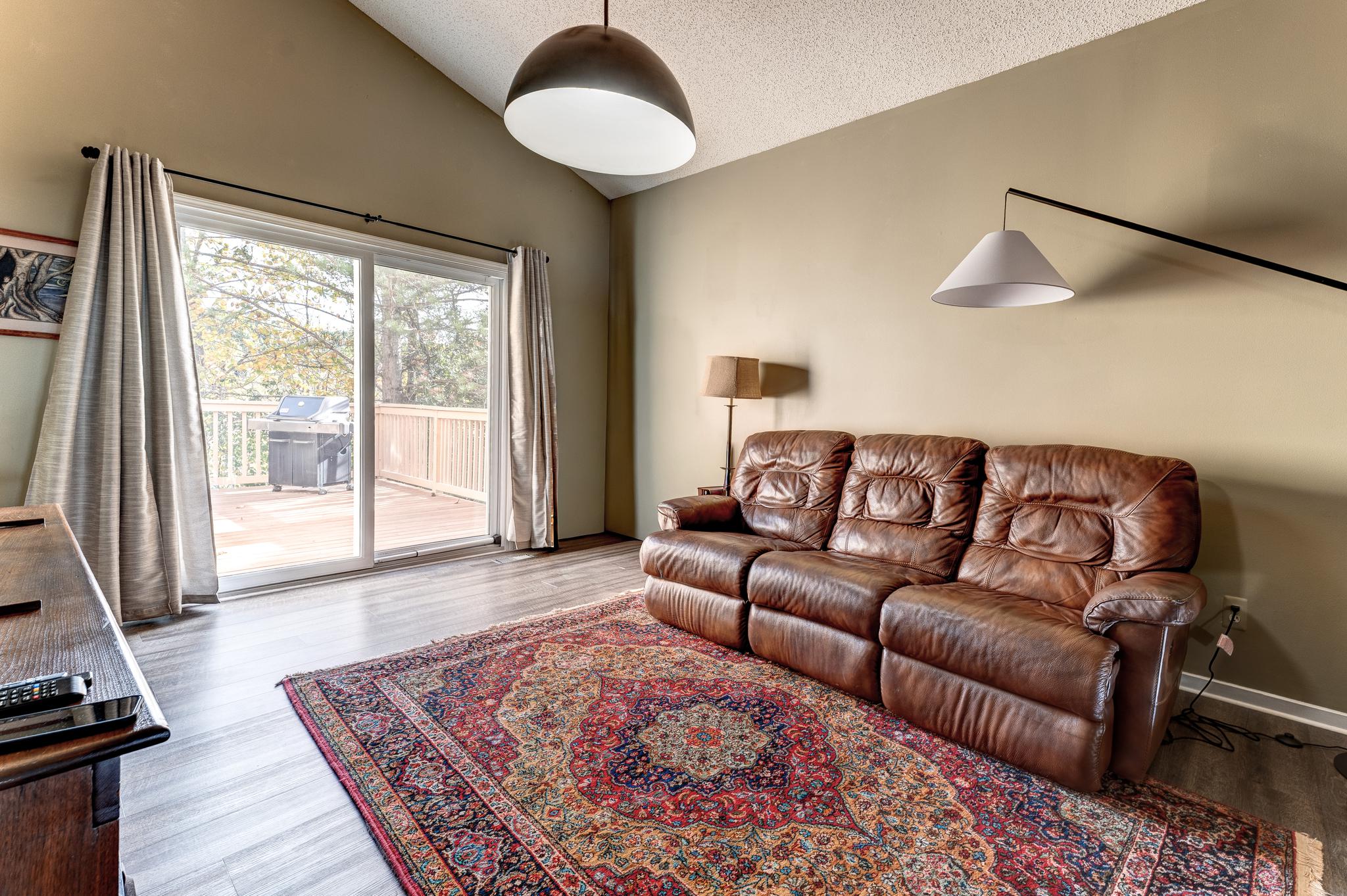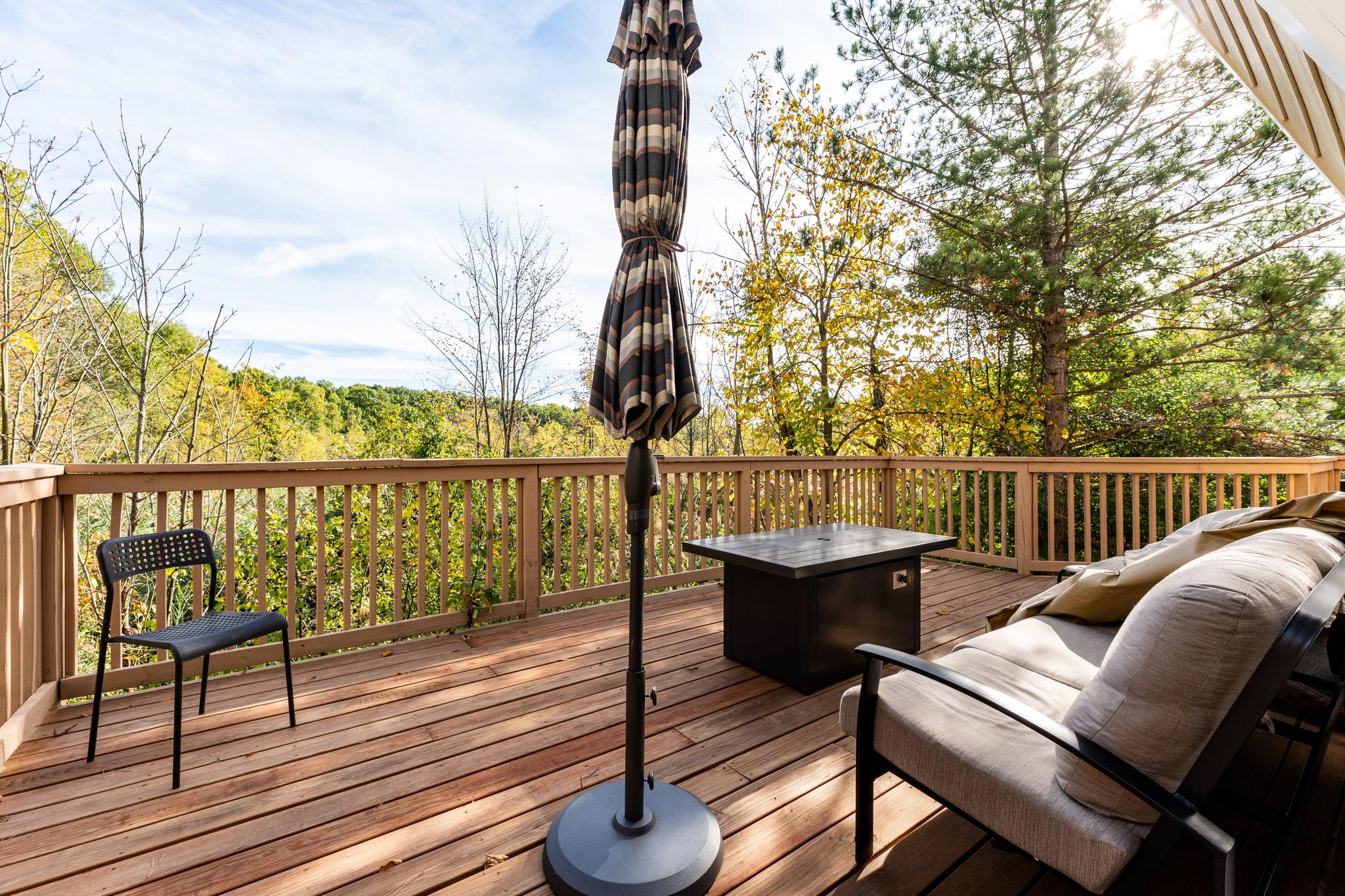 The updated granite kitchen with white cabinetry and a sunlit dining area opens into the spacious great room, featuring a cozy gas fireplace and access to the expansive deck. A separate family room with soaring vaulted ceilings and its own deck access provides additional space for relaxing or entertaining.